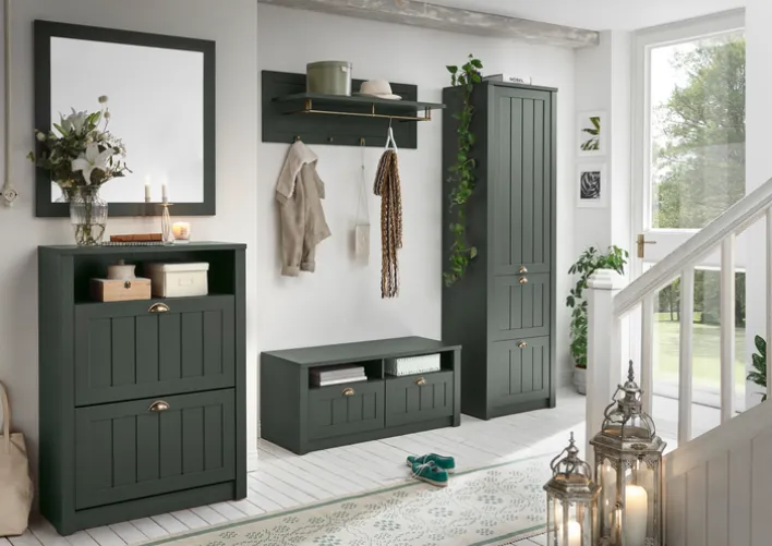 Der grüne Garderobenschrank ASCOT mit den goldfarbigen Griffen aus Metall hat die Maße 60 Zentimeter Breite, 204 Zentimeter Höhe und 42 Zentimeter Tiefe. In den beiden Schubkästen und hinter der Drehtüre bietet das Modell viel Stauraum.