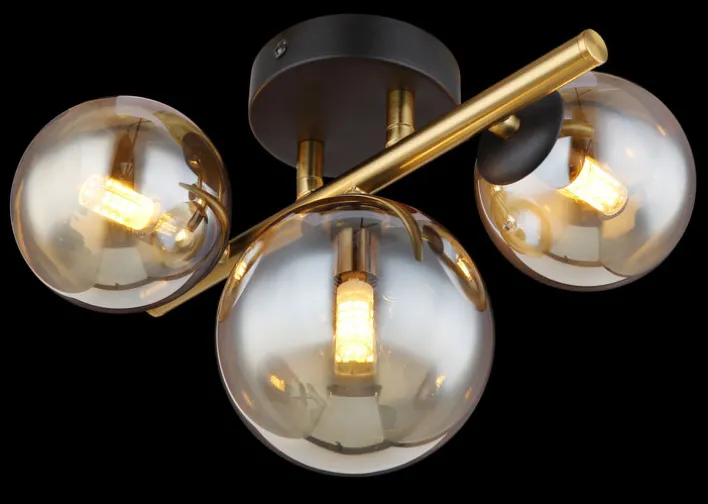 Die Basis der Leuchte RIHA aus dem Hause GLOBO ist ein runder, mattschwarzer Metallsockel. Am messingfarbigen Metallkorpus sind drei LED-Fassungen des Typs G9 angebracht. GLOBO liefert die Lampe mit passenden Leuchtmitteln aus, die gewechselt werden können. Diese haben eine Leistung von 10,5 Watt und eine Helligkeit von 1050 Lumen. Durch die im Durchmesser 10 bzw. 12 cm messenden Glasschirme werfen die Leuchten ein angenehm warmes Licht.