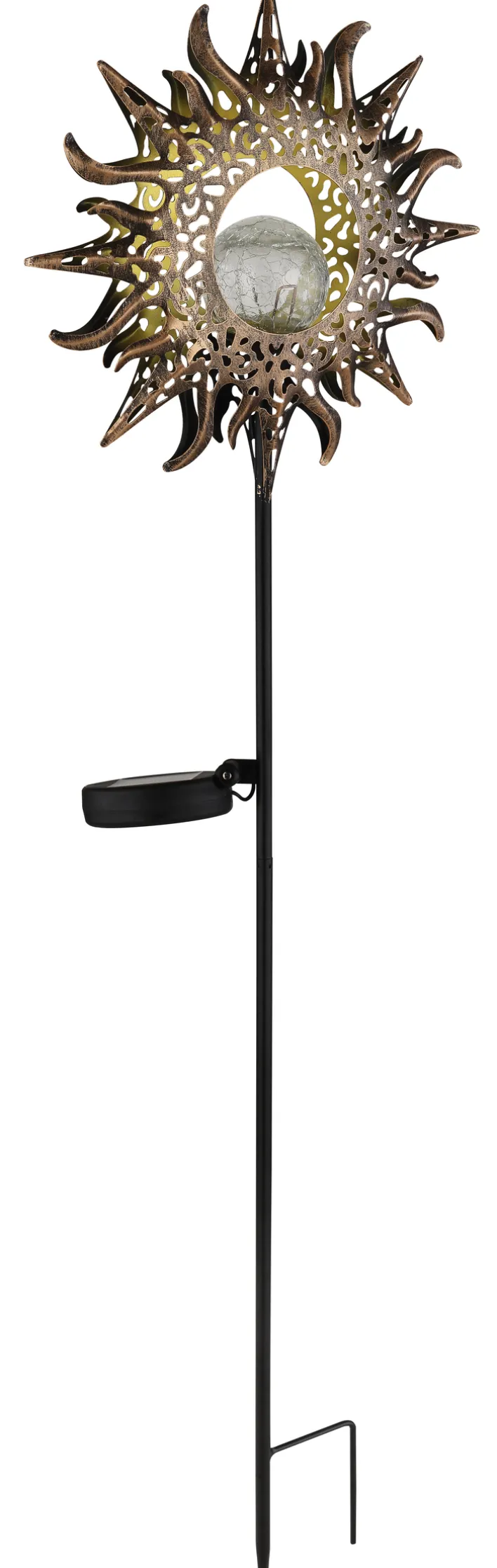 Die GLOBO LED Solarlampe NATALIA mit schwarzem Spieß ist 81 cm hoch. Sie ist einer Sonne nachgebildet, aus rostfarbenem Metall mit Crackle-Glas und spritzwassergeschützt.