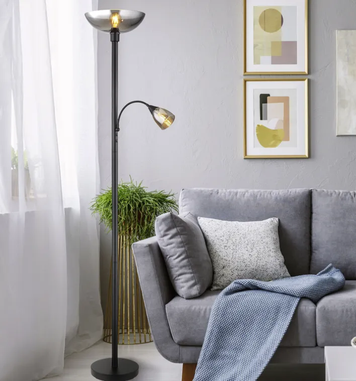 Der GLOBO Retrofit Deckenfluter mit Leselampe BLADE aus Metall in Schwarz und Rauchglas in Grau verleiht jedem Beleuchtungskonzept ein Plus an Flexibilität.
