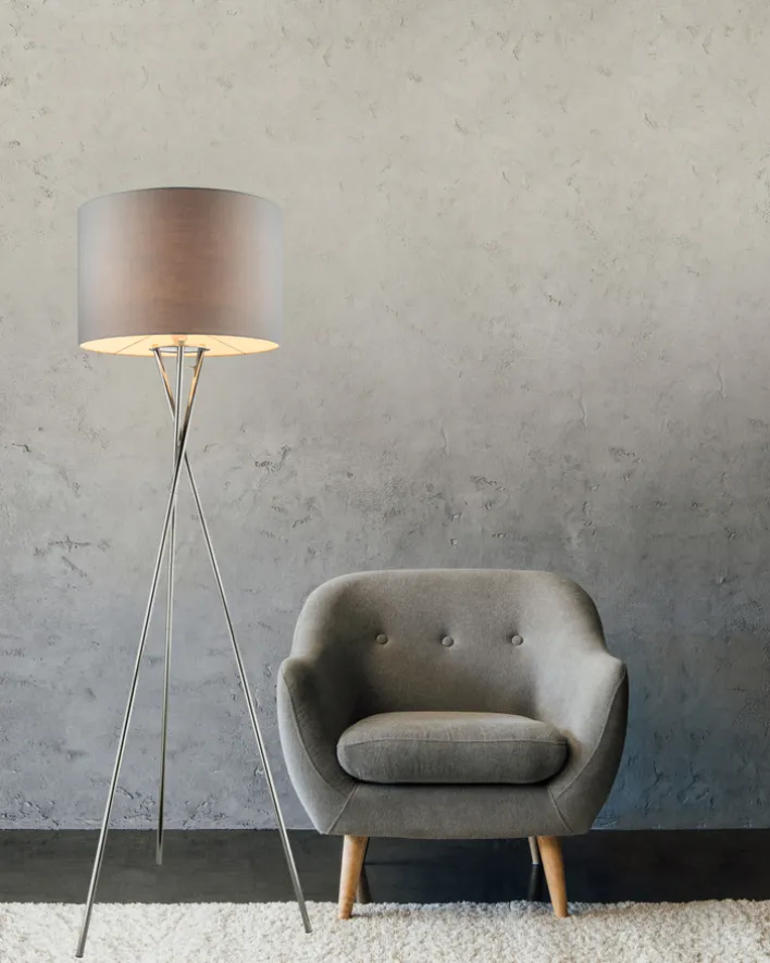 Die 1-flammige Retrofit Tripod Stehlampe GUSTAV von GLOBO hat eine Höhe von 160 cm und ist die perfekte Ergänzung für den modern eingerichteten Wohnbereich. Durch das tolle Design im angesagten Skandi-Stil ist die Leuchte mit ihrem chromfarbigen Dreifußgestell und einem Schirm in der Farbe Grau der Blickfang im Wohn- oder Esszimmer. Sie ist mit verschiedenen Möbeln gut kombinierbar und hat ihren Platz neben einem Sessel oder einer Polstergarnitur. Die Stehlampe sorgt für ein angenehmes Licht und schafft eine wohnliche Atmosphäre.