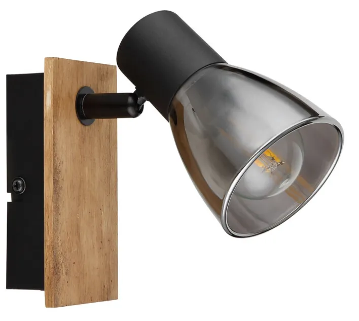 Dieser Strahler aus braunem Holz, schwarzem Metall und Rauchglas hat eine Ausladung von 15,5 cm, eine Höhe von 14 cm sowie eine Breite von 7 cm. Er ist verstellbar und verfügt über einen Ein-/Ausschalter. Das Leuchtmittel, das auswechselbar ist, kann separat bestellt werden. Es handelt sich dabei um einen AGL- und Retrofit-Beleuchtungstyp, der 40 Watt verbraucht. Diese Wandlampe kann sowohl verwendet werden, um im Raum Licht zu spenden oder um ein Wandbild zu beleuchten.