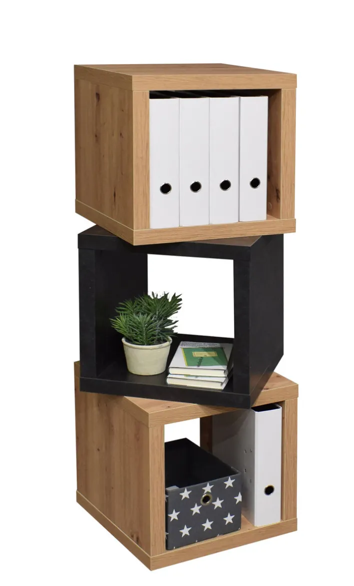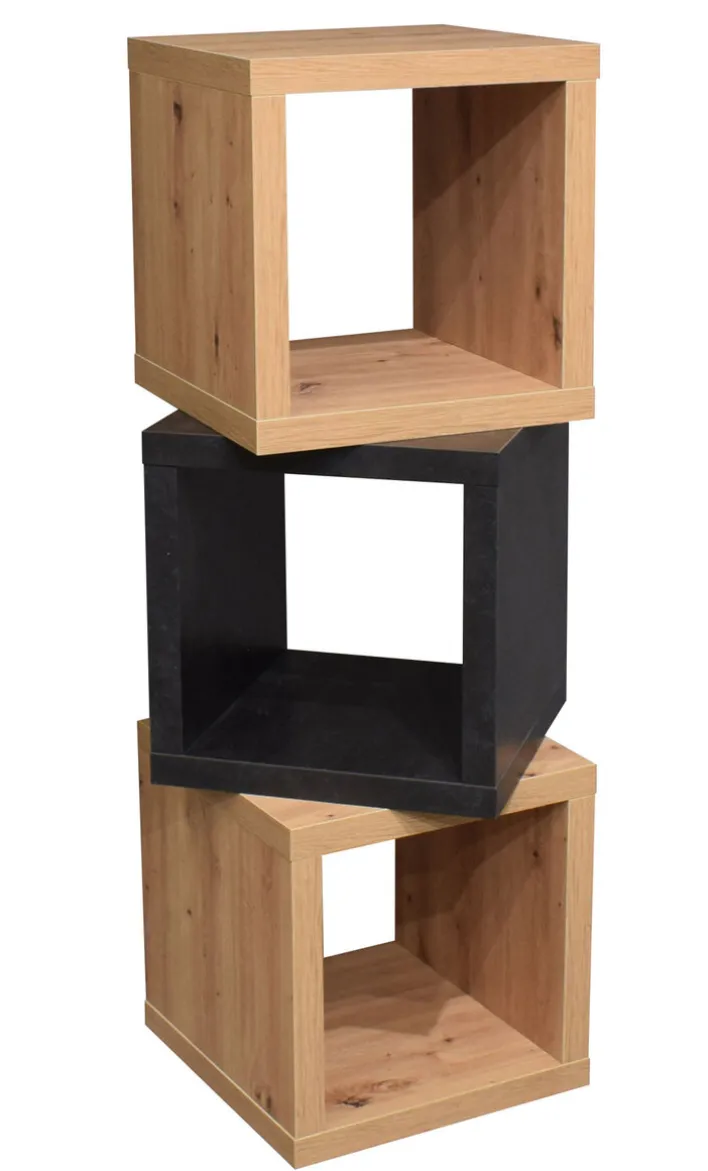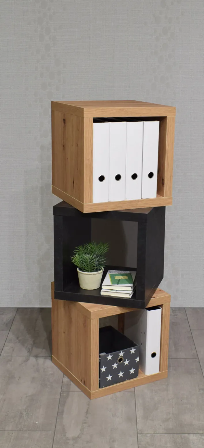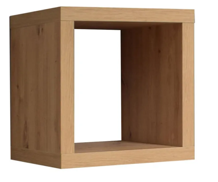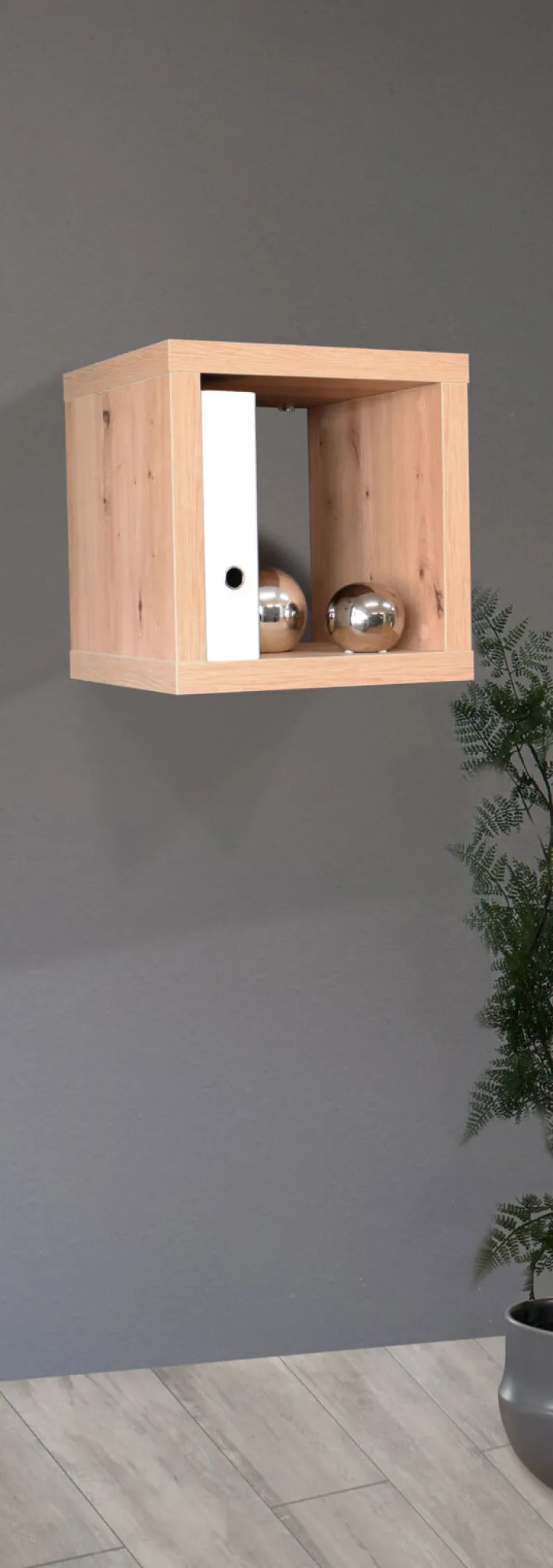 Das Hängeregal AARON hat eine 40 x 40 cm Würfelform und ist ausgestattet mit Möbelgleiter und Aufhängung. Das Material, eine Holznachbildung, in Eiche Optik. Weitere Farben sind erhältlich.