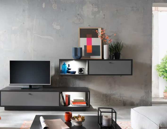 Der aus einer mitteldichten Faserplatte gearbeitete Schrank fasziniert mit einer praktischen Aufteilung. Ein Fach des Hängeschranks ist komplett offen gestaltet, während das andere Fach mit einer leicht zu öffnenden Klappe kombiniert ist. Diese Klappe und die geschlossene Seite des Modells sorgen in hellem Grau für einen interessanten farblichen Kontrast zum dunklen Anthrazit. Die Oberfläche der Spanplatten ist mit Melaminharz beschichtet, sodass Staub rasch entfernt ist.