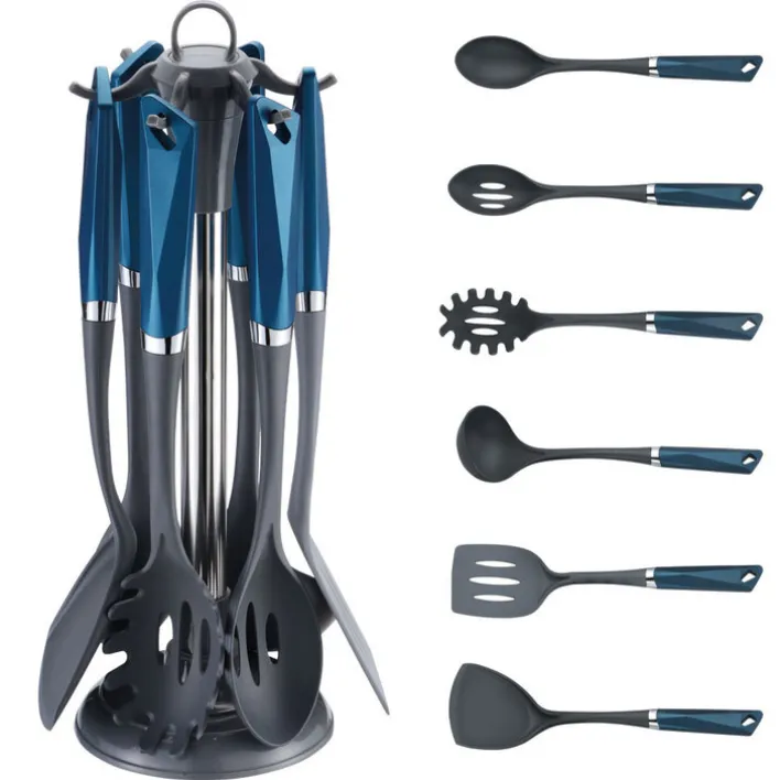Das 7-teilige Küchenhelfer Set von HATEX ist aus beständigem Kunststoff (Nylon) hergestellt. Die Griffe in Petrol sind mit einem silberfarbigen Einsatz vom vorderen Teil abgesetzt und sorgen für einen optischen Blickfang in der Küche. Der Ständer dient zur praktischen und platzsparenden Aufbewahrung. Der obere Teil ist drehbar und ermöglicht dadurch einen einfachen Zugriff auf alle Utensilien.