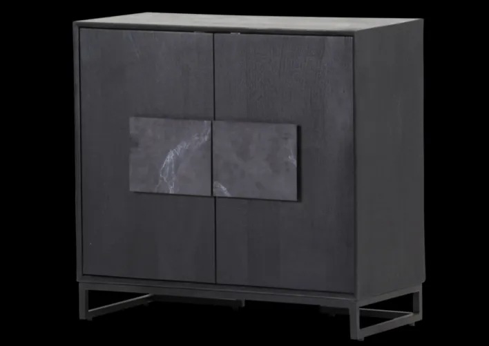 Mit einer Breite von 85 cm, einer Höhe von 80 cm und einer Tiefe von 47 cm bietet die Kommode ausreichend Stauraum. Sie verfügt über zwei Drehtüren und einen Einlegeboden, die eine flexible Nutzung ermöglichen. Die Fronten sind mit einem auffälligen, marmorähnlichen Muster versehen, das dem Möbelstück einen besonderen Akzent verleiht. Die Kombination aus Holz, Metall und Kunststoff sorgt für Stabilität und Langlebigkeit.
