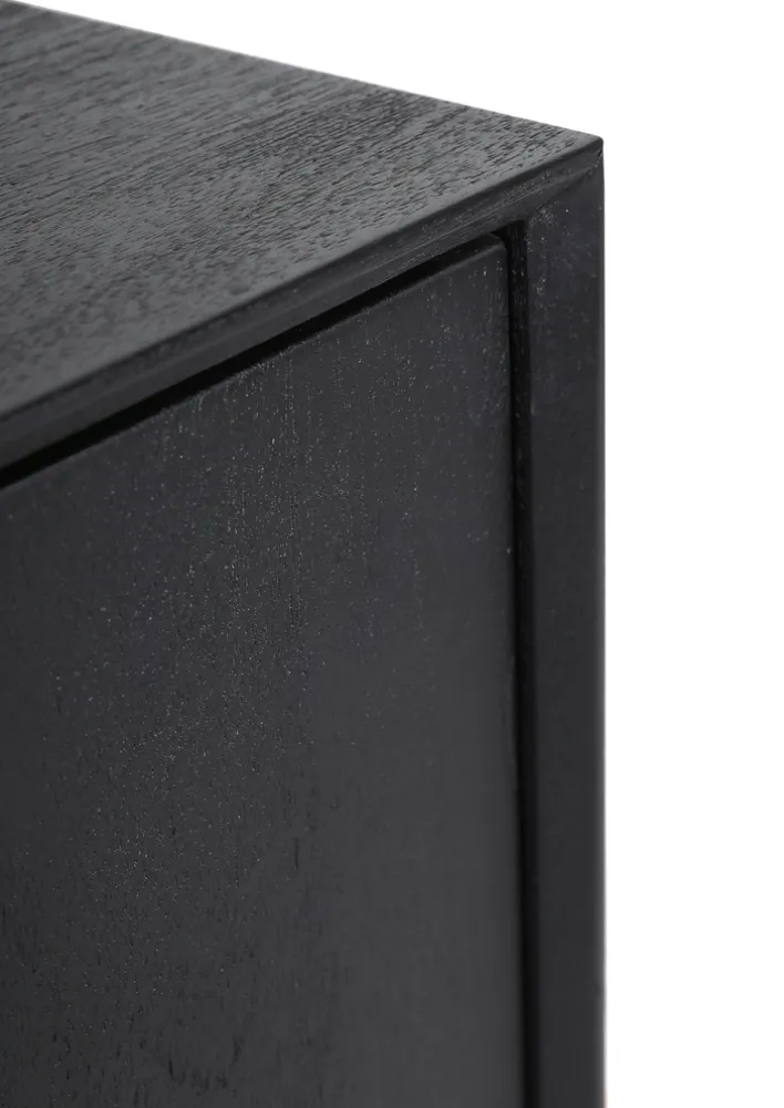 Die Kommode aus der Serie AGGLO besticht durch ihr modernes Design und die hochwertige Verarbeitung. Gefertigt aus massivem Akazienholz, das schwarz gebeizt und lackiert ist, bietet sie eine elegante und zeitlose Optik. Die rechteckige Form und die klaren Linien unterstreichen den modernen Stil, während die schwarzen Metallgriffe und das Soft-Close-System für eine komfortable Handhabung sorgen.