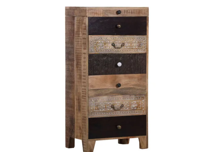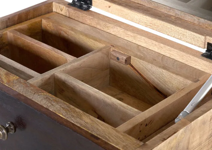 Die INTERhome Kommode PUNO ist aus robustem Mango-Massivholz und Akazien-Massivholz gefertigt und zieht mit ihren unterschiedlich gestalteten Fronten alle Blicke auf sich. Dank der Verwendung von massivem Holz ist die Kommode zudem sehr robust. In den insgesamt sechs Schubkästen bietet das Möbelstück jede Menge Platz für Alltagsgegenstände. Die oberste Schublade hält jedoch eine Besonderheit bereit: Unter der Oberplatte mit Klapp-Funktion versteckt sich ein Spiegel und die Schublade selbst ist mit einer praktischen Fachinneneinteilung versehen.