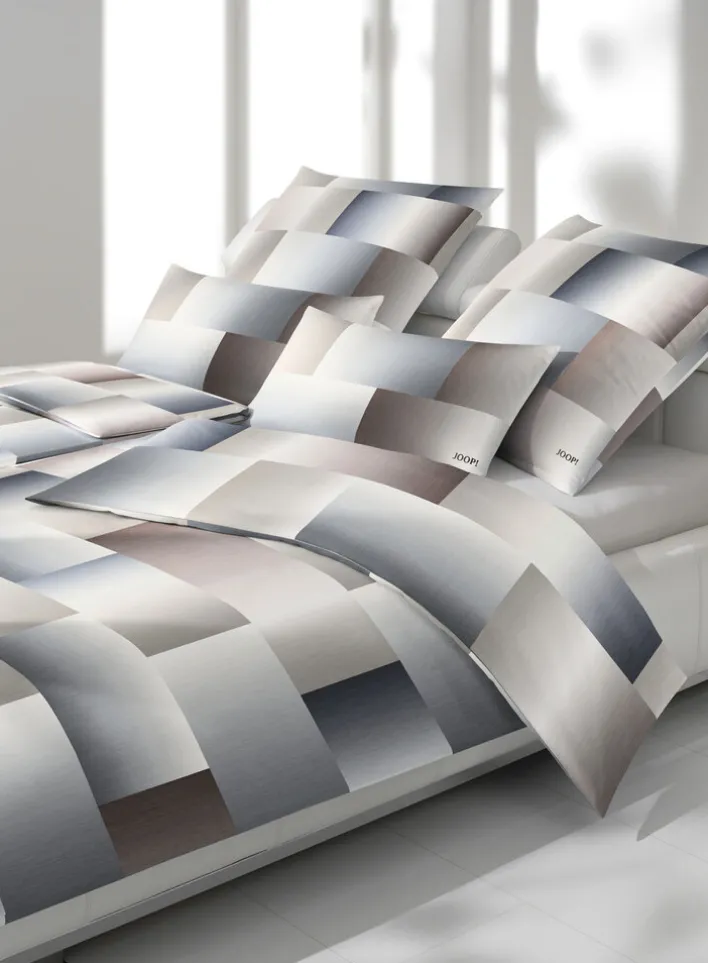 Die JOOP! Satin-Bettwäsche RANGE steht für beste Qualität aus Deutschland. Sie trägt ein grafisches Muster in den Farben Braun und Grau. Das textile Material besteht zu 100 % aus Baumwollsatin.