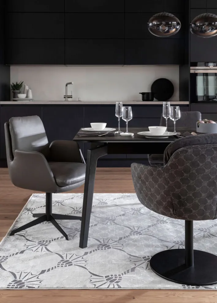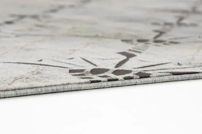 Der silberfarbige Teppich CORNFLOWER DOUBLE hat eine Größe von 140 x 200 cm und fällt durch ein wunderschönes florales Muster auf. Seine Gesamtflorhöhe beträgt 6 mm.