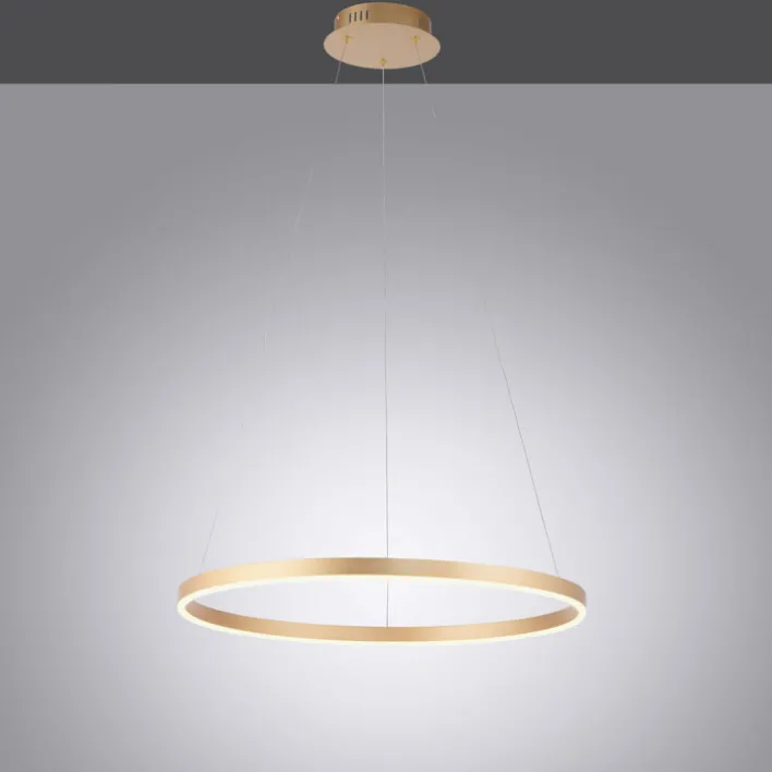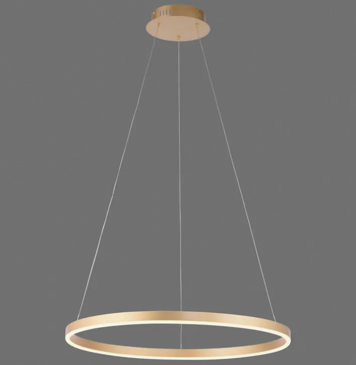 Die ringförmige LED Pendelleuchte RITUS von JUST LIGHT hat einen Durchmesser von 58 cm und ist die optimale Beleuchtung für den modern eingerichteten Wohn- oder Essbereich. Die messingfarbige Leuchte mit einer Brennstelle fügt sich harmonisch in bereits bestehende Einrichtungen ein und kommt über runden und eckigen Esstischen optimal zur Geltung. Ausgestattet mit Switchmo ist die Leuchte in drei Stufen dimmbar. Dadurch sorgt die Pendelleuchte immer für eine angenehme Beleuchtung. Die Befestigung und das ringförmige Pendel der Pendelleuchte RITUS sind aus hochwertig verarbeitetem Kunststoff hergestellt. Das sparsame LED-Leuchtmittel ist fest in das Gehäuse eingebaut. Die Pendelleuchte ist CE-geprüft und für den Innenbereich geeignet.