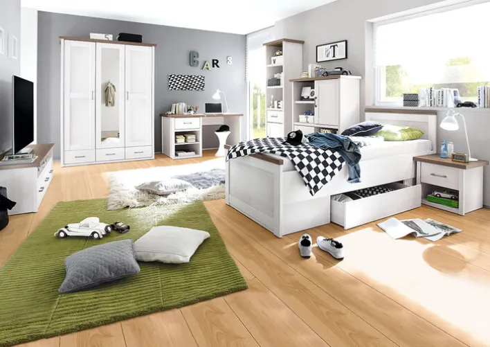 Der Kinder-Drehtürenschrank aus der Serie LUCA vereint Funktionalität und ansprechendes Design im Landhausstil. Mit einer Breite von 148 cm, einer Höhe von 201 cm und einer Tiefe von 62 cm bietet er großzügigen Stauraum. Der Schrank verfügt über drei Drehtüren, von denen eine mit einer Spiegelfront ausgestattet ist, was nicht nur praktisch ist, sondern auch den Raum optisch vergrößert. Die Hauptfarbe des Schranks ist Weiß mit einer Absetzung in Trüffel-Optik, die dem Möbelstück eine elegante Note verleiht.