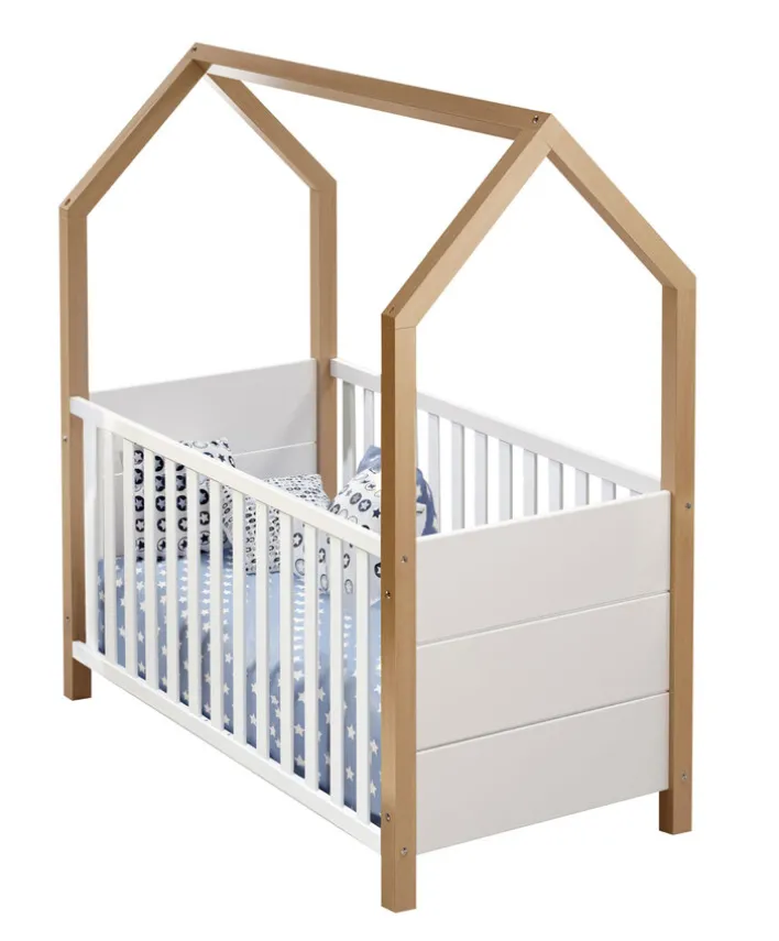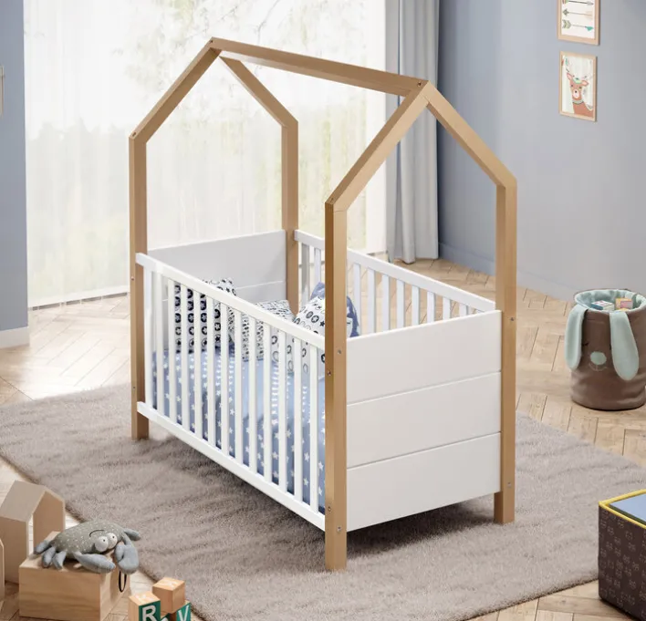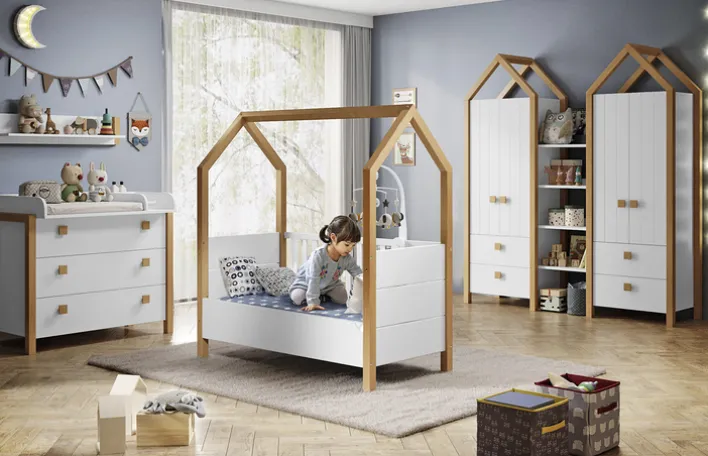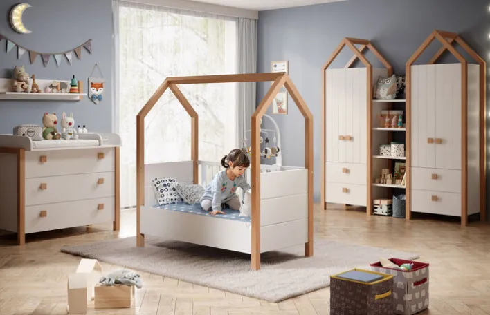 Das Kinderbett BEACH in Form eines kleinen Häuschens kombiniert Kiefer Weiß mit Absetzungen in Birke und verleiht dem Babyzimmer im Handumdrehen eine gemütliche Atmosphäre.