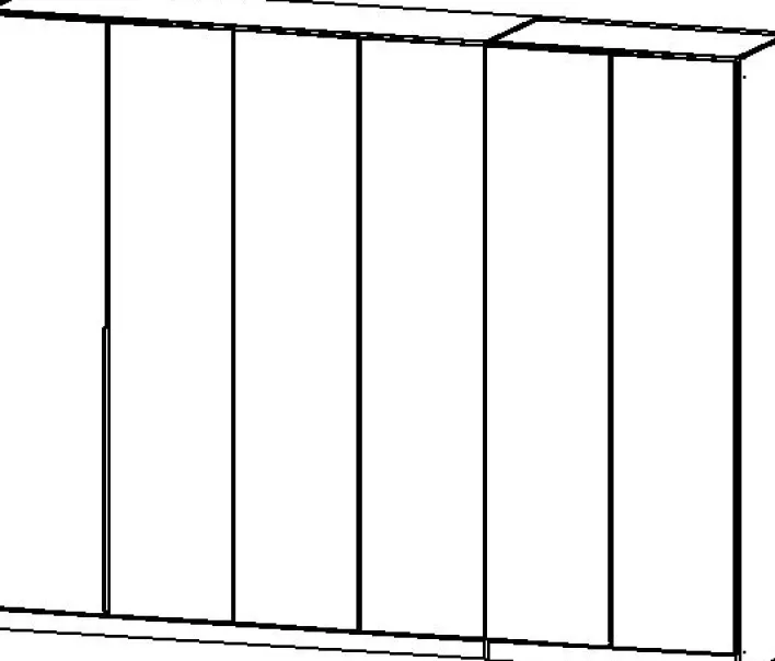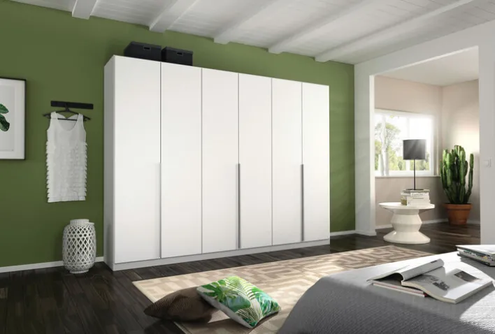 Hochkant sind drei silberfarbige Leisten als Griffe angebracht. So wirkt der Schrank ausgesprochen elegant und wird in der Raumhöhe betont. Hinter den sechs Drehtüren sind drei Einlegeböden und drei Kleiderstangen angebracht. Die Fronten zeigen Spiegelglas. Der Schrank passt ideal in weiße Schlaf- und Gästezimmer sowie in schwarz-weiße Räume und zu hellen Holzfarben. Sein umfangreiches Inneres bietet reichlich Platz für die ganze Garderobe und reicht meist auch für zwei Personen.