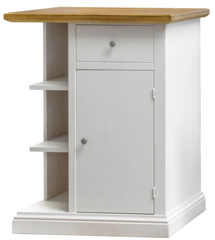 Die teilmassive Kommode ist ein praktisches Möbelstück für jeden Raum. Staumöglichkeiten gibt es in den drei offenen Fächern, hinter der Drehtür sowie in dem Schubkasten.