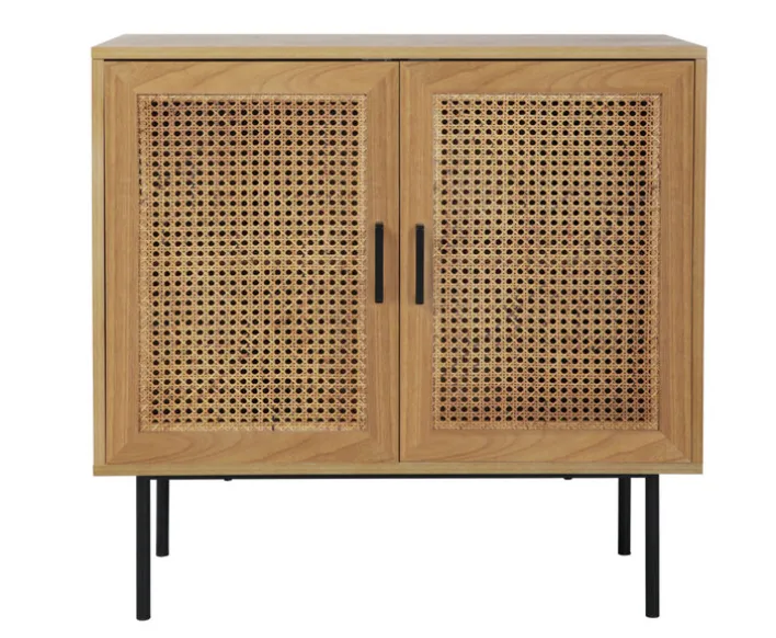 Die aus Holzfurnier gefertigte und mit Metallfüßen versehene Kommode kommt mit zwei Drehtüren und hat reichlich Aufbewahrungskapazität im Gepäck. Sie eignet sich zur Lagerung von Geschirr im Esszimmer, Vasen und Dekoartikeln im Wohnzimmer und ist für Schlafzimmer sowie Flure nutzbar.