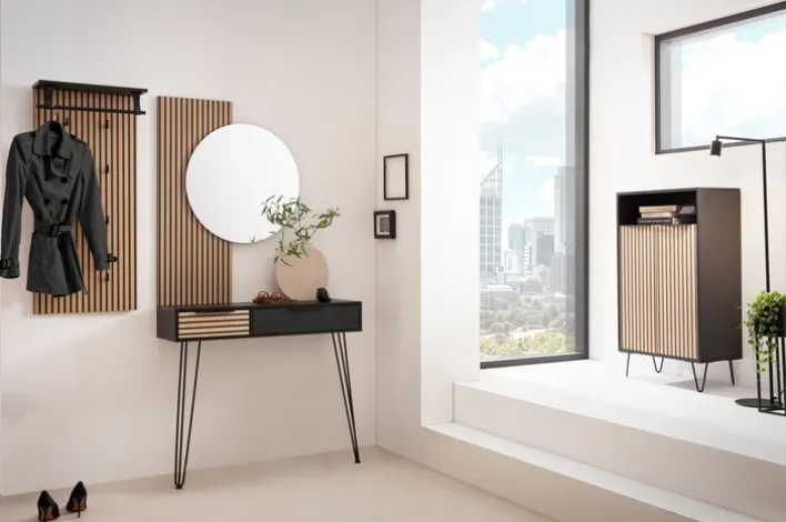 Gefertigt aus Holznachbildung, bietet der Konsolentisch eine robuste und pflegeleichte Ablagefläche. Die filigranen, schwarzen Metallbeine verleihen dem Tisch eine elegante Leichtigkeit und passen perfekt zum modernen Stil. Die Soft-Close-Funktion der Schubkästen sorgt für ein geräuschloses und sanftes Schließen, was den Komfort im Alltag erhöht. Dieser Tisch ist eine ideale Ergänzung für jeden Wohnraum, der Funktionalität und stilvolles Design vereint.
