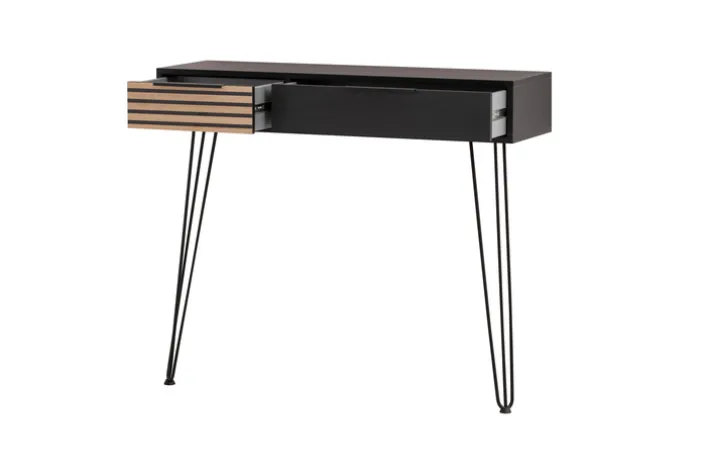 Der Konsolentisch besticht durch sein modernes Design und die Kombination aus schwarzen und braunen Farbtönen. Die Maße des Tisches betragen 103,7 cm in der Breite, 88,4 cm in der Höhe und 32,05 cm in der Tiefe, bei einem Gewicht von 20,5 kg. Der Tisch verfügt über zwei Schubkästen, die praktischen Stauraum bieten. Eine der Schubladen ist mit einem auffälligen Streifenmuster in Holzoptik gestaltet, das einen interessanten Kontrast zur schwarzen Oberfläche bildet.