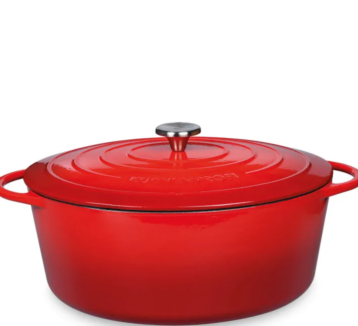 Mit dem KÜCHENPROFI Bratentopf PROVENCE wird jedes Gericht zum Fest. Der oval geformte Topf mit einer Breite von 33 cm ist aus robustem Gusseisen und Edelstahl gefertigt. Die in leuchtendem Rot emaillierte Oberfläche schmückt Herd und Küche im Landhausstil. Beim Servieren am Tisch kommt der Topf mit Deckel besonders gut zur Geltung.