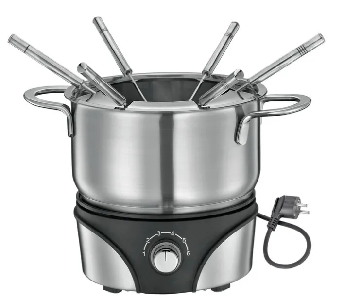 Das Fondue besteht aus hochwertigem Edelstahl, das mit einer silberfarbigen Oberfläche, einer hohen Rostbeständigkeit und pflegeleichten Eigenschaften überzeugen kann. Einige Komponenten bestehen außerdem aus schwarzem Kunststoff. Der Fondue-Topf hat ein Fassungsvermögen von 1,5 Liter und ist mit einem Spritzschutz, einem Rechaud und sechs Fonduegabeln mit Markierungen ausgestattet. Er besitzt eine Leistung von 1200 Watt und bietet einen Temperaturbereich von 50 bis 210 °C, der sich per Drehregler einstellen lässt.