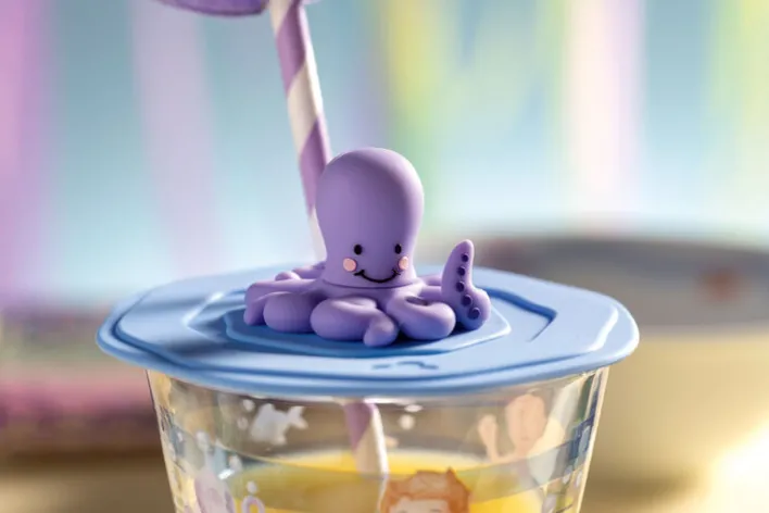 Mit den fröhlichen Deckeln der LEONARDO Serie BAMBINI AVENTURA lassen sich die Getränke in Gläsern und Tassen sicher vor Insekten und herabfallenden Pflanzenteilen schützen. Das Modell Krake ist in Blau und Violett gehalten und überzeugt mit dem fröhlich lächelnden Gesicht eines sympathischen Meerestiers.