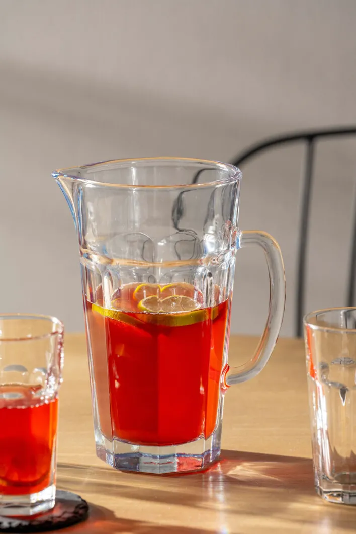 Dieser Krug der Serie ROCK mit dem klassischen Talleyrand ist so schön praktisch, um Eistee, gekühlte Säfte oder Wasser zu servieren. Die Glas-Serie ROCK hat eine achteckige bzw. polygonale Grundform und kann dadurch wunderbar in Ihrer Hand gehalten werden. Vom Fuß verlaufende breite Kerben schwingen sich nach außen in den glatten Rand. Dieses traditionelle Tallyrand Design ist sehr beliebt, denn der klassische Stil ist zeitlos und immer modern.