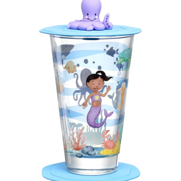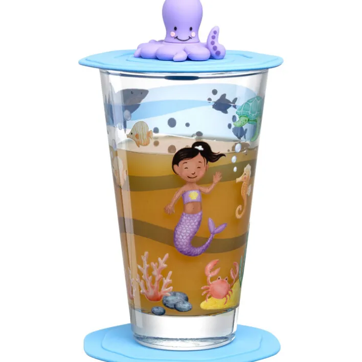 Eine Meerjungfrau und ein Meermann tanzen auf dem konischen Glas zwischen dem Seetang mit den Fischen und anderem Meeresgetier. Durch den Deckel, der über den Rand des Glases hinausragt, wird verhindert, dass Staub oder Insekten in das Getränk gelangen. Um den Deckel einfacher anzuheben, sitzt eine lustige, winkende Krake mittig auf dem hellblauen Deckel. Das Glas selbst ist konisch und hat einen starken Boden für die Standfestigkeit. So macht Trinkglas BAMBINI AVVENTURA Meer Set gute Laune und spricht die Fantasie an.