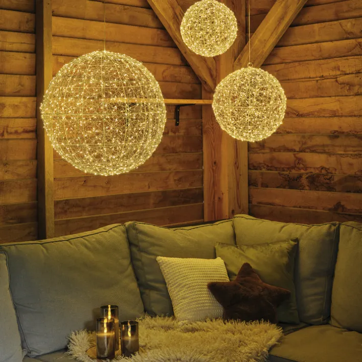 Das silberfarbige Lichtobjekt Micro LED Rahmen 28x28x28cm ist mit 400 fest eingebauten LED-Leuchten ausgestattet und wird über die Steckdose mit Strom versorgt. Ein Trafo ist inklusive. Das warmweiße Licht sorgt in Wohninnenräumen und Außenbereichen für weihnachtliche Stimmung. Der runde Advents- und Weihnachtsschmuck wirkt in der Dunkelheit wie eine Art Himmelskörper, der die Nacht erhellt.