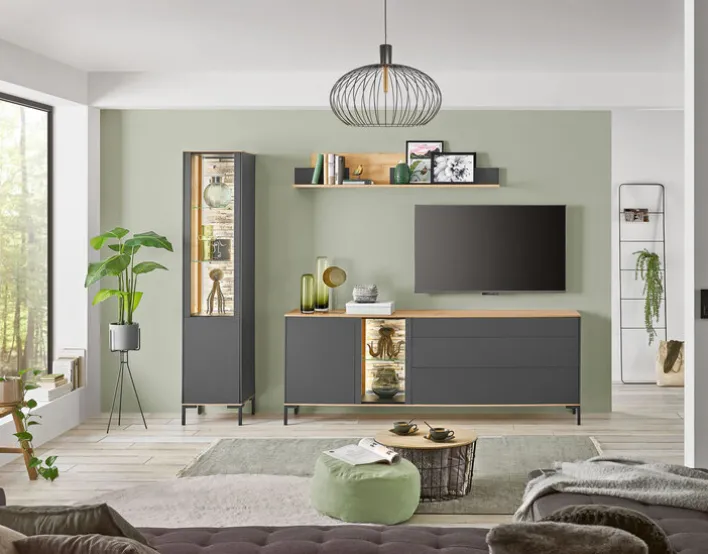 Das hochwertig verarbeitete Lowboard COMO präsentiert sich elegant mit Oberflächen in einem anthrazitfarbigem Mattlack und einem Asteiche Dekor. Durch das zeitlose Design und die elegante Gestaltung bietet das Lowboard mit LED-Beleuchtung und Push-To-Open Türen zahlreiche Kombinationsmöglichkeiten. Die Glastür-Rückwand mit Holzapplikation macht das Board zum Blickfang. Hinter einer Klappe, einer Drehtür und in einem Schubkasten stehen viel Platz und Stauraum zur Verfügung. Das Lowboard schafft ein wohnliches Ambiente im modern eingerichteten Wohnzimmer.