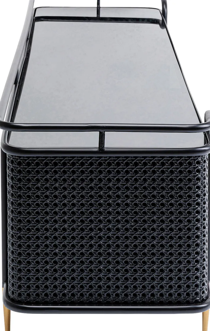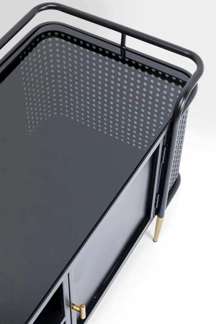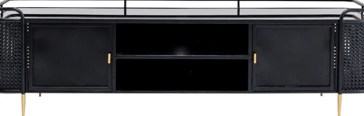 Das Lowboard aus der Serie FENCE von Kare Design vereint Funktionalität und stilvolles Design im Industrial-Stil. Mit einer Breite von 160 cm, einer Höhe von 51 cm und einer Länge von 40 cm bietet es ausreichend Platz für Ihre Mediengeräte und Dekorationen. Die Hauptfarbe Schwarz wird durch goldfarbene Akzente ergänzt, die dem Möbelstück eine elegante Note verleihen. Die Kombination aus pulverbeschichtetem Stahl und Sicherheitsglas sorgt für Stabilität und Langlebigkeit.