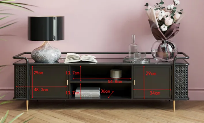 Das Lowboard verfügt über zwei Schiebetüren und zwei offene Fächer, die vielseitige Aufbewahrungsmöglichkeiten bieten. Die Griffe sind dezent integriert und unterstreichen das moderne Design. Die rechteckige Form und die klaren Linien machen das Möbelstück zu einem Blickfang in jedem Raum. Mit einer maximalen Belastbarkeit von 20 kg eignet es sich ideal als Ablage für verschiedene Gegenstände. Die Verwendung von mitteldichter Faserplatte (MDF) und die hochwertige Verarbeitung garantieren eine lange Lebensdauer.