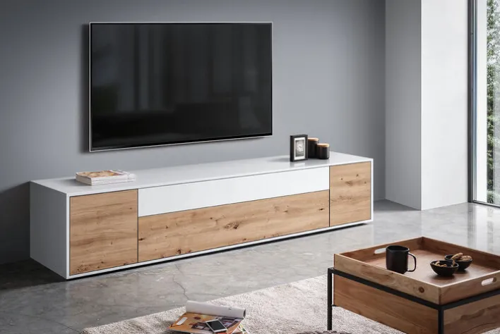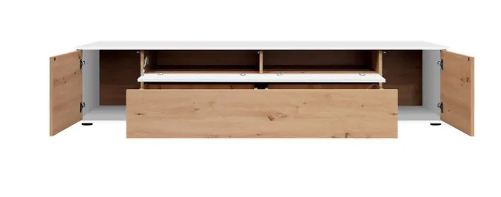 Das Lowboard JOHN verfügt über eine Breite von 220 cm, eine Tiefe von 43 cm und eine Höhe von 44 cm. Die Kombination aus mattweißen Fronten und Korpus mit Dekor in Eiche prägt das klare, moderne Erscheinungsbild. Die Oberflächen sind grifflos gestaltet und mit Push-to-open-Funktion ausgestattet, was eine einfache Bedienung ermöglicht. Das Möbelstück bietet einen Schubkasten, zwei Drehtüren und eine Klappe, wodurch unterschiedliche Aufbewahrungsmöglichkeiten entstehen. Die Fronten und der Korpus bestehen aus Kunststoff mit Melaminharz-Beschichtung, was für pflegeleichte und robuste Eigenschaften sorgt. Das Lowboard eignet sich für den Einsatz im Innenbereich, insbesondere im Wohnbereich.