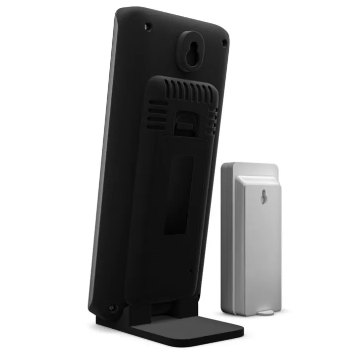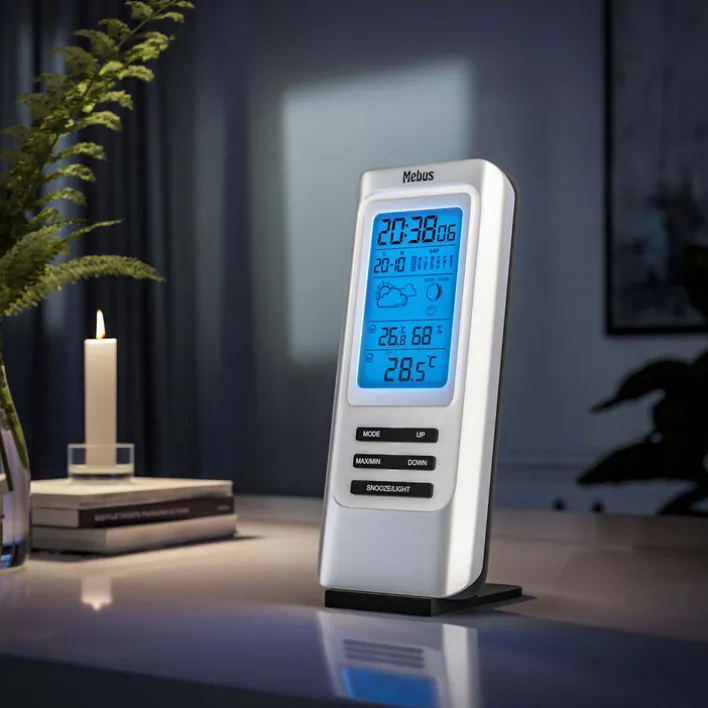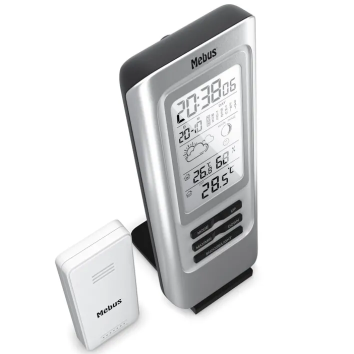 Die funkgesteuerte Mebus Wetterstation 40627 bietet eine Temperaturanzeige für Innen und Außen in wahlweise °C oder °F sowie ein Hygrometer für Innen und Außenbereich. Neben diesen Basisfunktionen und der Uhrzeit wartet sie mit Kalender und Wecker, Mondphasen-Anzeige und einer Wettervorhersage mit Symbolen auf. Ein Raumklima Sensor rundet die Funktionen der Wetterstation ab. Dank blauer Hintergrundanzeige sind die Messdaten gut ablesbar. Für den Betrieb sind zwei AA / zwei AAA-Batterien notwendig.