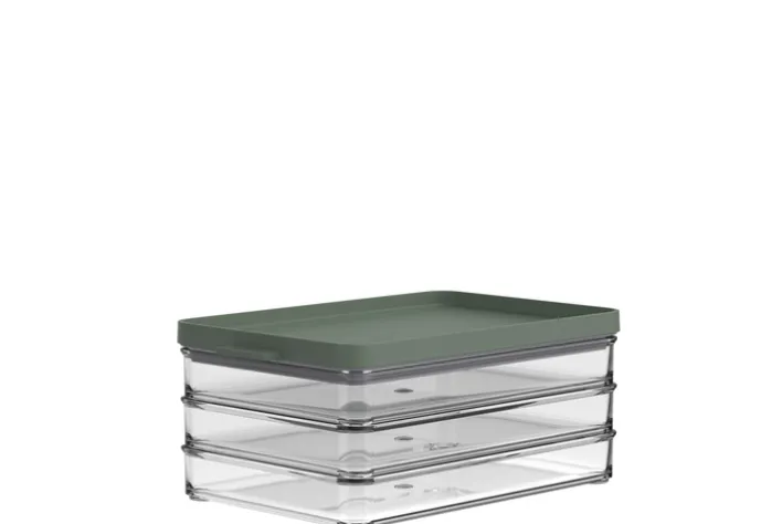 Die MEPAL Kühlschrankdose OMNIA ist dreilagig aufgebaut und verfügt über einen Deckel im eleganten Farbton Nordic Sage. Die einzelnen Behälter bestehen aus transparentem, thermoplastischem Elastomer, der Deckel aus robustem ABS-Kunststoff. Das Gesamtvolumen der drei Lagen beträgt 1,5 Liter, ideal zur Aufbewahrung von Aufschnitt. Alle Ebenen lassen sich luft- und aromadicht verschließen. Das Material ist BPA-frei, hygienisch und spülmaschinengeeignet. Dank der transparenten Ausführung ist der Inhalt jederzeit gut sichtbar. Der Deckel ist leicht vertieft gestaltet und eignet sich auch hervorragend zum Servieren. Mit kompakten Maßen von 14,9 x 10 x 23 cm passt die Dose perfekt in jeden Kühlschrank.