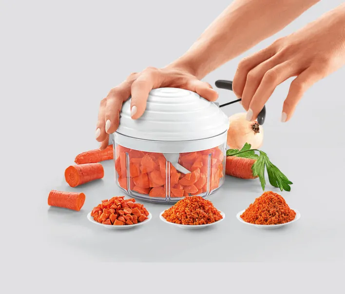 Der hochwertige Zerkleinerer ist aus stabilem Kunststoff gefertigt. Die scharfen Klingen sind aus säurefestem, geschmacksneutralem und lebensmittelechtem Edelstahl hergestellt. Alle Teile des Multi-Zerkleinerers sind einfach von Hand oder in der Spülmaschine zu reinigen.