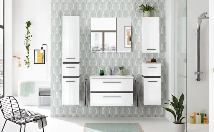 Der Musterring Hochschrank RIMINI präsentiert sich mit einem topmodernen Design in Schneeweiß und Dunkelgrau. Er hat eine Größe von 33 x 32 x 168,5 cm und schafft jede Menge Stauraum im Badezimmer.