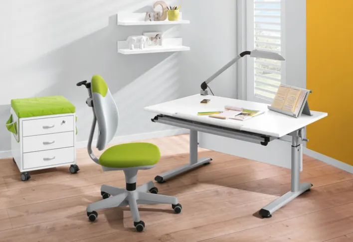 Der PAIDI Drehstuhl PEPE ist mit einem waschbaren Sitz- und Rückenlehnenbezug in Grün/Weiß ausgestattet und besitzt ein darauf abgestimmtes silberfarbenes Gestell mit stabilem Fußkreuz. Die ergonomisch geformte und in der Tiefe verstellbare Lehne entlastet den Rücken und die leicht nach unten gewölbte Sitzfläche bietet einen angenehmen Sitzkomfort. Der Sitz kann stufenlos in der Höhe reguliert werden.