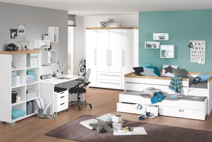 Das Unternehmen PAIDI stellt den Kleiderschrank KIRA in gradlinigem Design aus hochwertigen Materialien her. Er präsentiert seine pflegeleichten Oberflächen im zeitlos attraktiven Farbton Kreideweiß, im oberen Bereich zeigt er eine Absetzung in Holz-Dekorfarbe Eiche. Vier Drehtüren verschließen perfekt ausgestattete Innenräume, die beiden mittigen Türen lassen im unteren Bereich Platz für zwei geräumige Schubkästen. Der Kleiderschrank fungiert mit seinem umfangreichen Platzangebot als Ordnungshüter im Reich des Nachwuchses. Im Onlineshop von porta Möbel finden Sie weiteres Interieur fürs Kinderzimmer vom Hersteller PAIDI.