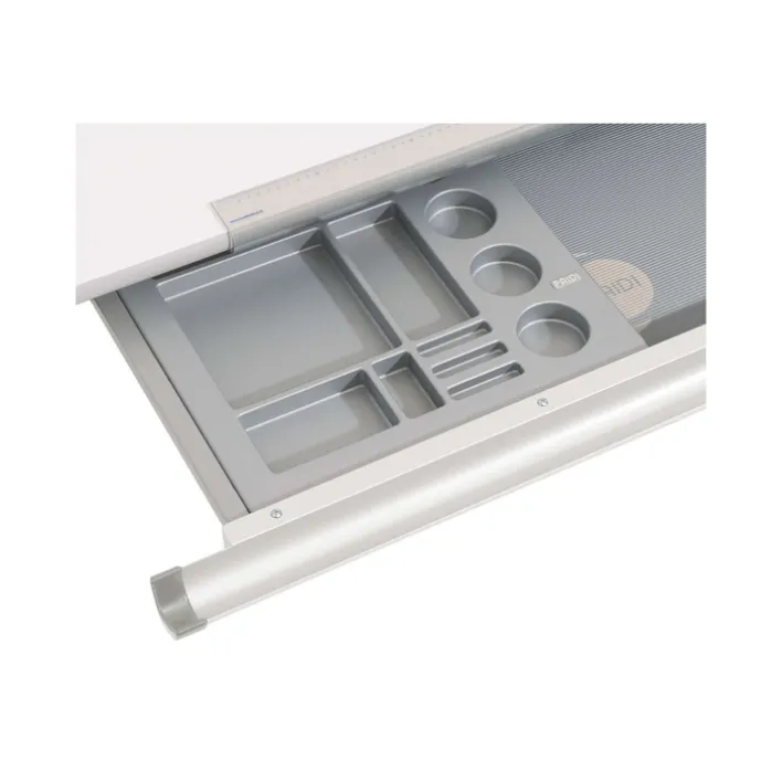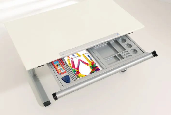 Die praktische Utensilienschale weist jedem Gegenstand seinen festen Platz zu, so dass nichts durcheinander fällt. Ausziehbar wie eine Schublade, ist die Utensilienschale flach. So bleibt unter der Schreibtischplatte immer noch ausreichend Platz für die Beine. In der Schale aus grauem Kunststoff finden alle Büromaterialien Platz, die am Schreibtisch benötigt wird. Für einen guten Start sorgt die Ausstattung von Faber-Castell, die mitgeliefert wird. Selbstverständlich bleibt noch ausreichend Platz für individuell gewählte Gegenstände – denn jeder arbeitet etwas anders.