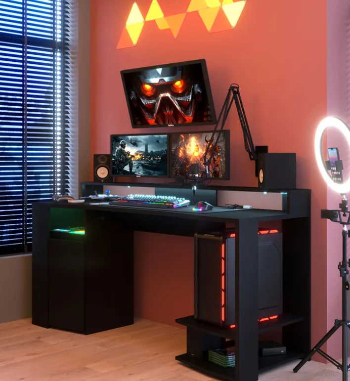 Der Parisot Gamertisch besteht aus Spanplatten in Holznachbildung. Die schwarze Oberflächenbeschichtung harmoniert mit modernen Büro- und Wohnräumen. In den Ablagefächern findet sich Stauraum für Gaming-Utensilien, Arbeitszubehör und einen Desktop-Computer. Mit stimmungsvoller Beleuchtung werden Spiele-Abenteuer zum Vergnügen und auch die täglichen Jobroutinen gehen leichter von der Hand.