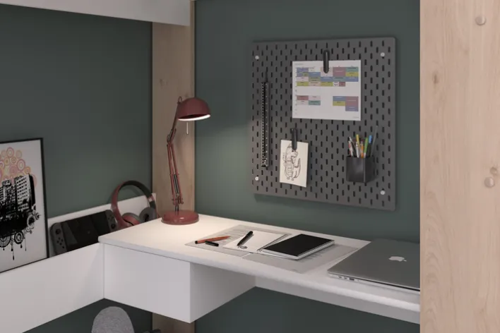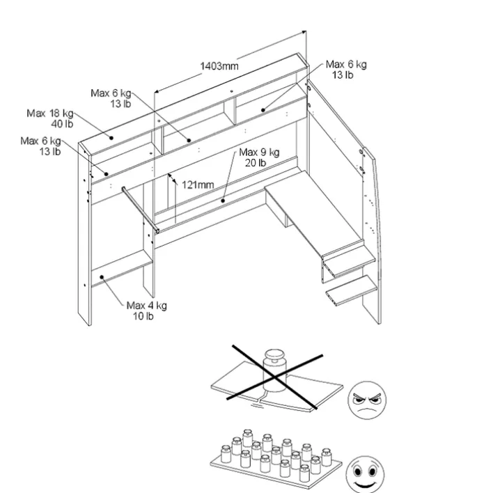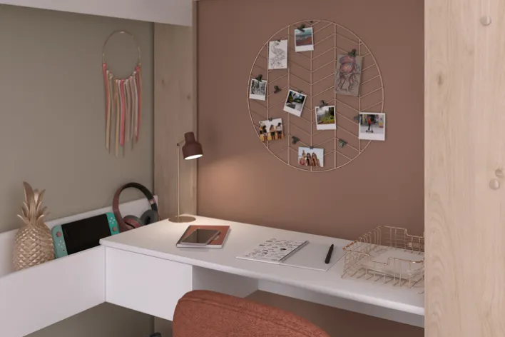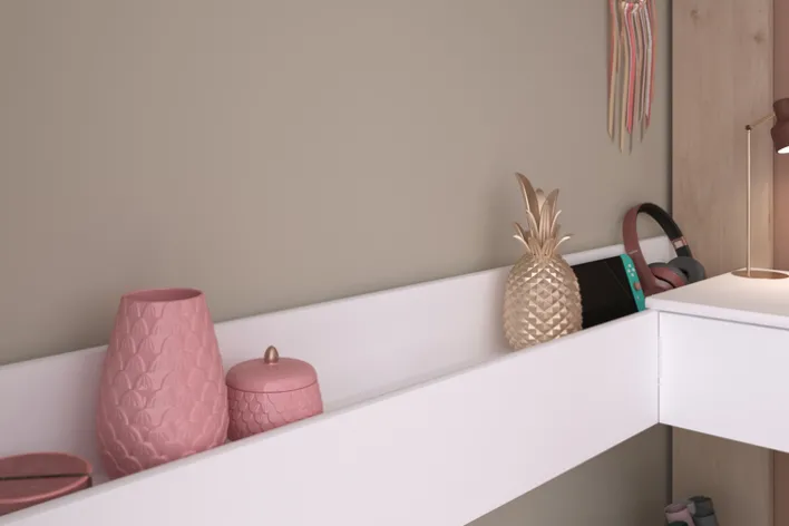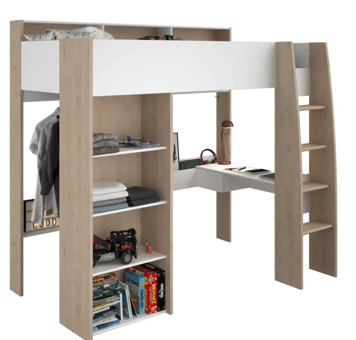 Das Parisot Hochbett SHELTER 11 ist in den Farben Braun und Weiß gehalten. Es wird ohne Matratze und ohne Lattenrost geliefert. Die Leiter ist im Lieferumfang enthalten. Dazu kommen ein Schreibtisch sowie ein Regal mit 3 Einlegeböden.