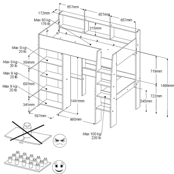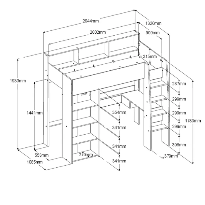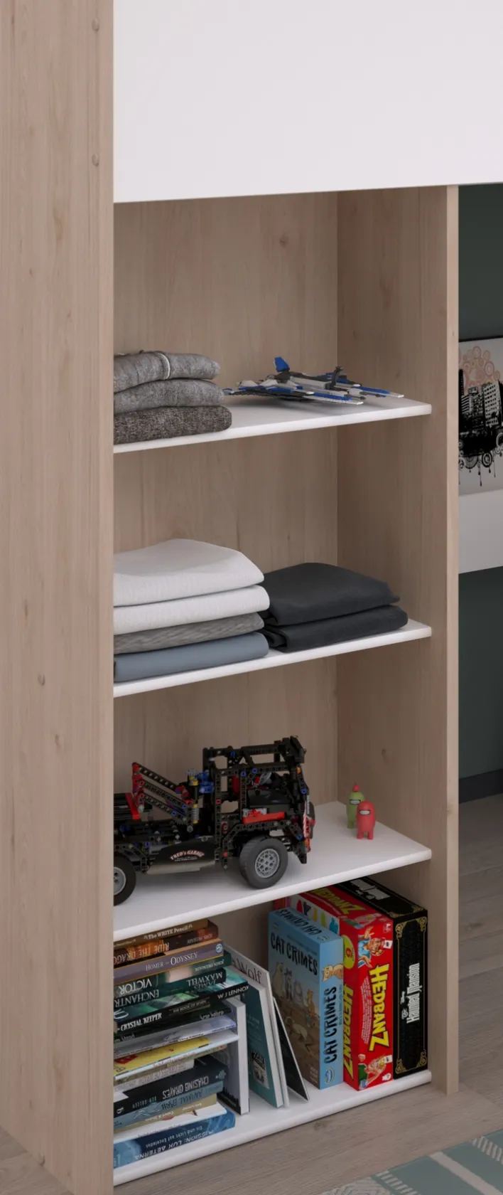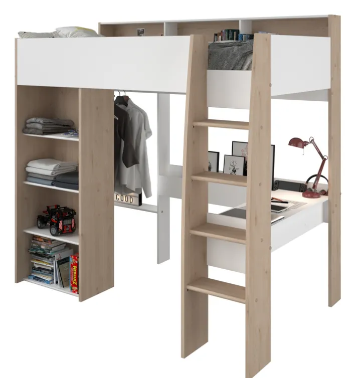 Es handelt sich um eine Holznachbildung in Jackson Eiche und Weiß. Das Hochbett ist 132 cm breit, 193 cm hoch und 204 cm lang. Es besitzt eine Liegefläche mit den Maßen 90 x 200 cm. Unter dem Bett befinden sich zusätzlich eine Garderobe und eine Ablageleiste. So bietet das Bett auf wenig Platz sehr viel Stauraum und eignet sich daher für kleine Räume.