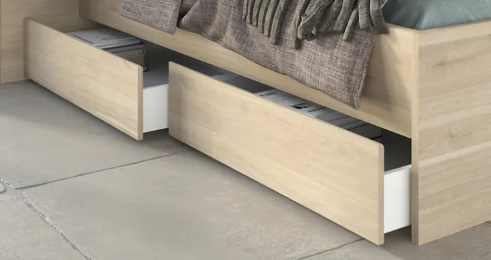 Einladend, robust und mit einem beeindruckenden, natürlichen Charme – so kommt das Parisot Stauraumbett ESCALE 3 in seinem dezenten Braun daher. Das aus hochwertiger japanischer Eiche gefertigte Schlafmöbel verfügt über zwei sehr geräumige Schubkästen und insgesamt vier Ablagen. Ein echtes Stauraumwunder, das noch dazu ausgesprochen attraktiv anzusehen ist.