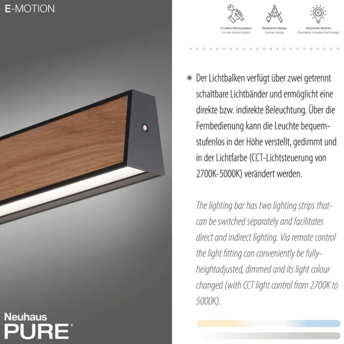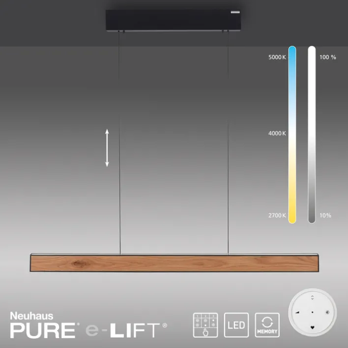 Mit dem schwarz-braunen LED-Balkenpendel PURE E-MOTION sichern sich Käufer ein optisches und funktionales Highlight. Die Pendelleuchte aus Aluminium und Holz weist Highlights wie einen E-Lift und eine Farbsteuerung auf. Der freischwingende Balken dieser Deckenleuchte beinhaltet zwei fest eingebaute LED-Leuchtmittel mit unterschiedlicher Helligkeit: Die Werte betragen 2.750 und 1.600 Lumen. Die Farbtemperatur beider Leuchtmittel lässt sich in einer Bandbreite von 2.700 bis 5.000 Kelvin individuell einstellen, sodass die Leuchte PURE E-MOTION ein breites Spektrum von warmweiß bis kaltweiß abdeckt. Dimmbar ist diese Designleuchte von Paul Neuhaus ebenfalls. Besondere Erwähnung verdient der praktische E-Lift-Antrieb für die Höhenverstellung. Sämtliche Einstellungen nehmen Nutzer komfortabel mit der mitgelieferten Fernbedienung vor!