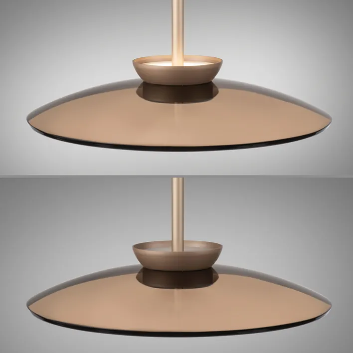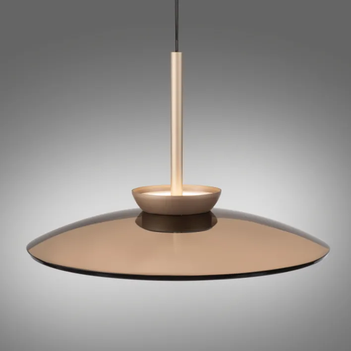 Die bronzefarbige LED Pendelleuchte PURE E-MOON mit 50 cm Durchmesser besteht aus Metall und getöntem Glas. Mit ihrer Up- & Downlight Funktionalität hat sie eine doppelte Lichtwirkung.