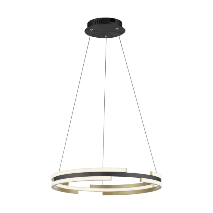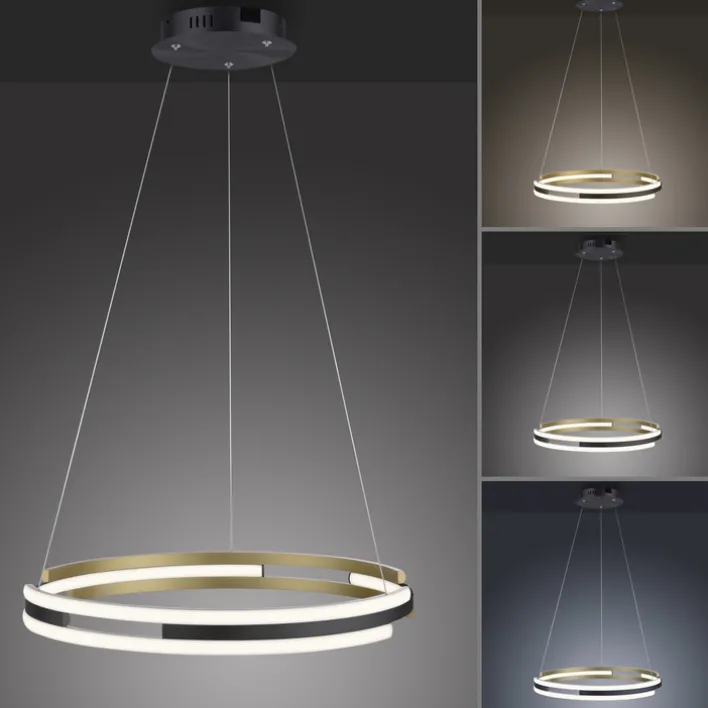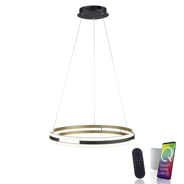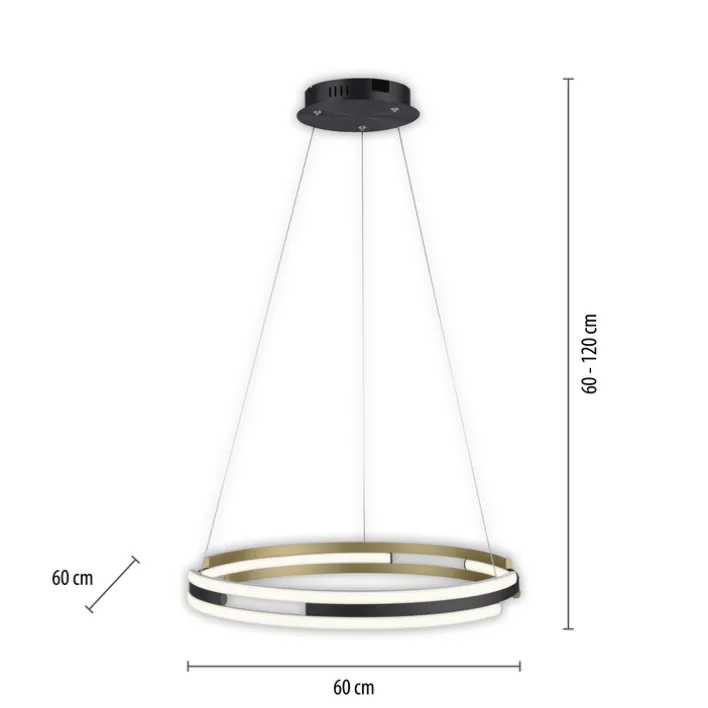 Die LED Pendelleuchte Q-BELUGA in Messing und Schwarz matt hat einen Durchmesser von 60 Zentimetern und ist höhenvariabel zwischen 60 und 120 Zentimetern einstellbar. Die alexafähige, dimmbare Pendellampe kann in jede Smart-Home Umgebung integriert werden.