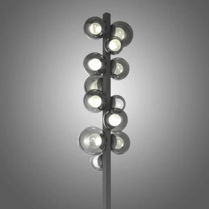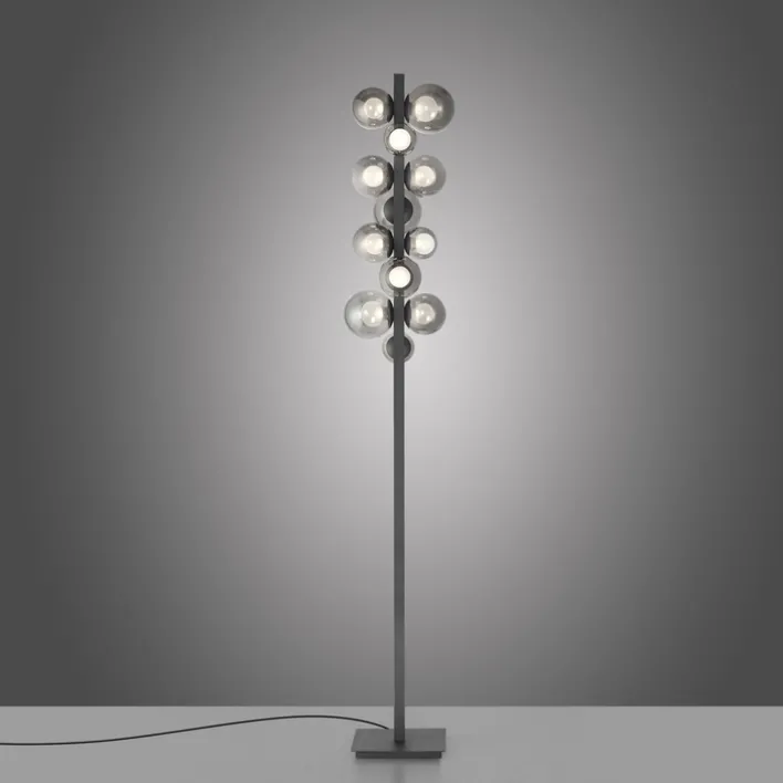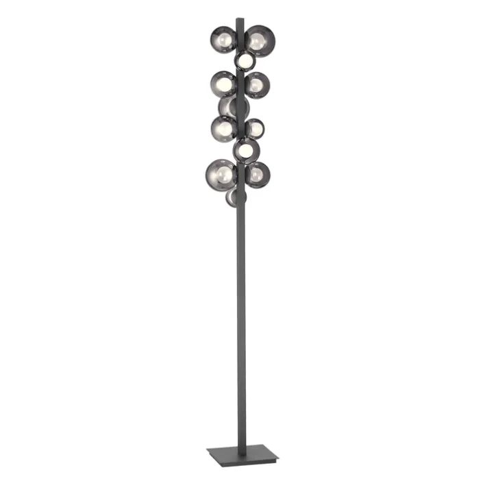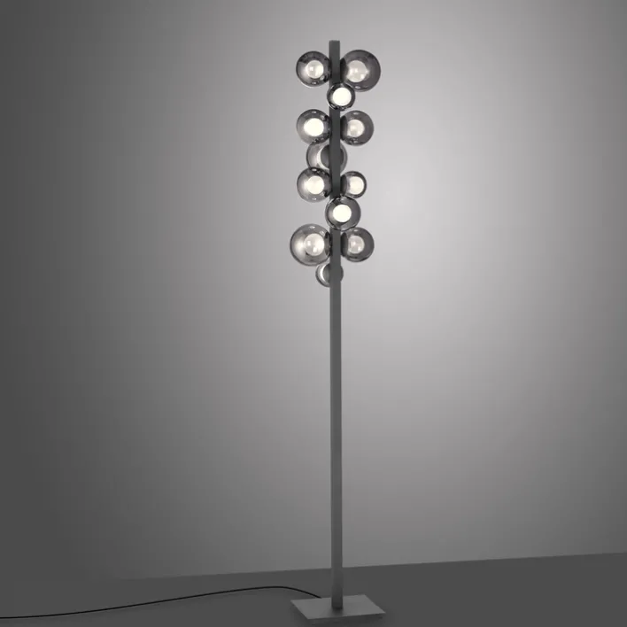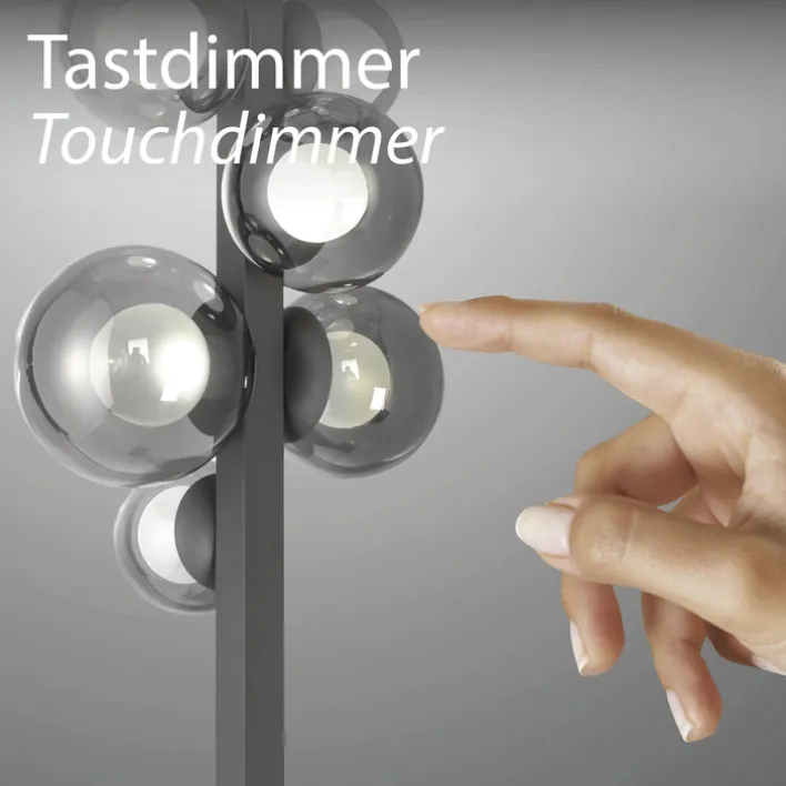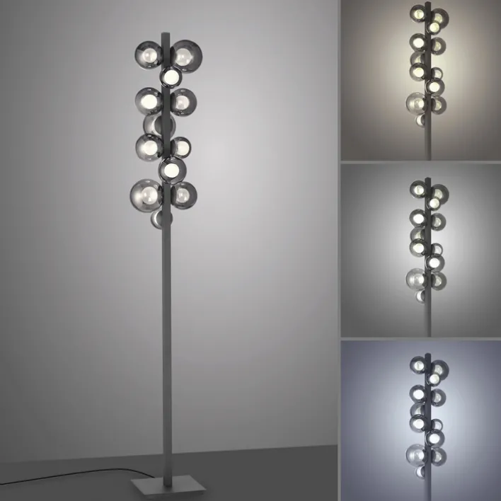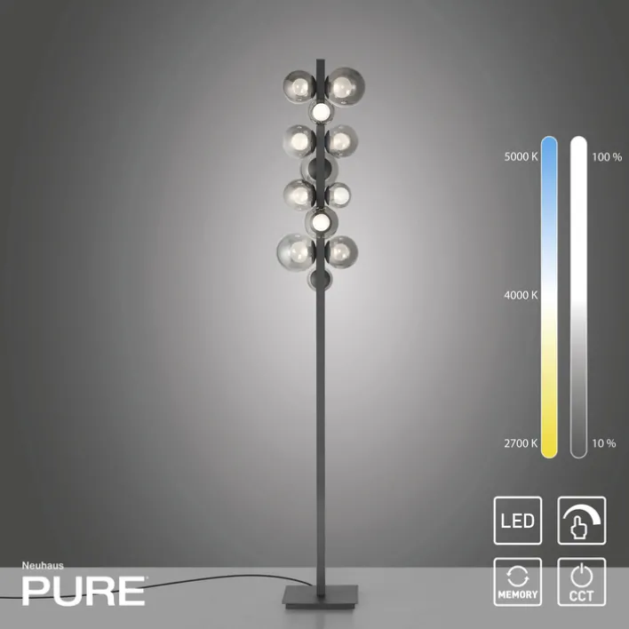 Die graufarbige LED Stehlampe PURE POPUP 12-flg besteht zu einem großen Teil aus Glas und ist 160 cm hoch. Sie verfügt über einen stufenlos anpassbaren Touchdimmer und bietet zahlreiche Einstellungsoptionen sowie eine Memory-Funktion.