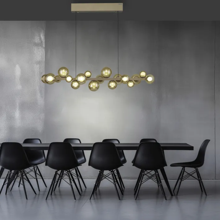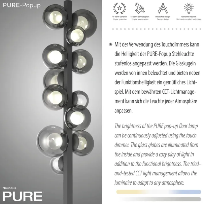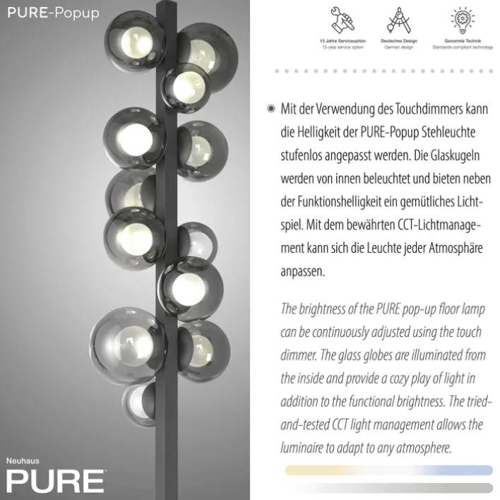 Das deutsche Design der LED Stehlampe PURE POPUP von Paul Neuhaus ist ebenso klassisch wie modern. Zudem sorgt der 12-flammige Aufbau für eine glanzvolle Erscheinung. Die 12 fest eingebauten LED-Leuchtmittel mit jeweils 2,4 Watt befinden sich in Kugeln aus hochwertigem Rauchglas. Zusammen bringen sie es auf eine Leistung von 28 Watt sowie eine dimmbare Helligkeit von bis zu 3.456 Lumen. Als weitere Besonderheit ist die Farbtemperatur der LEDs zwischen 2.700 und 5.000 Kelvin beziehungsweise von Warmweiß bis Neutralweiß einstellbar.