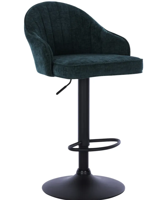 Der hohe Barhocker ist ideal für eine Bar im Partykeller oder für die Mahlzeiten an der Kücheninsel geeignet. Der weiche Bezug ist aus grünem Polyester gearbeitet. Das Säulengestell aus schwarzem Metall verfügt über eine Ablage für die Füße. Insgesamt kann der Stuhl bis zu einem Gewicht von 120 Kilogramm belastet werden.