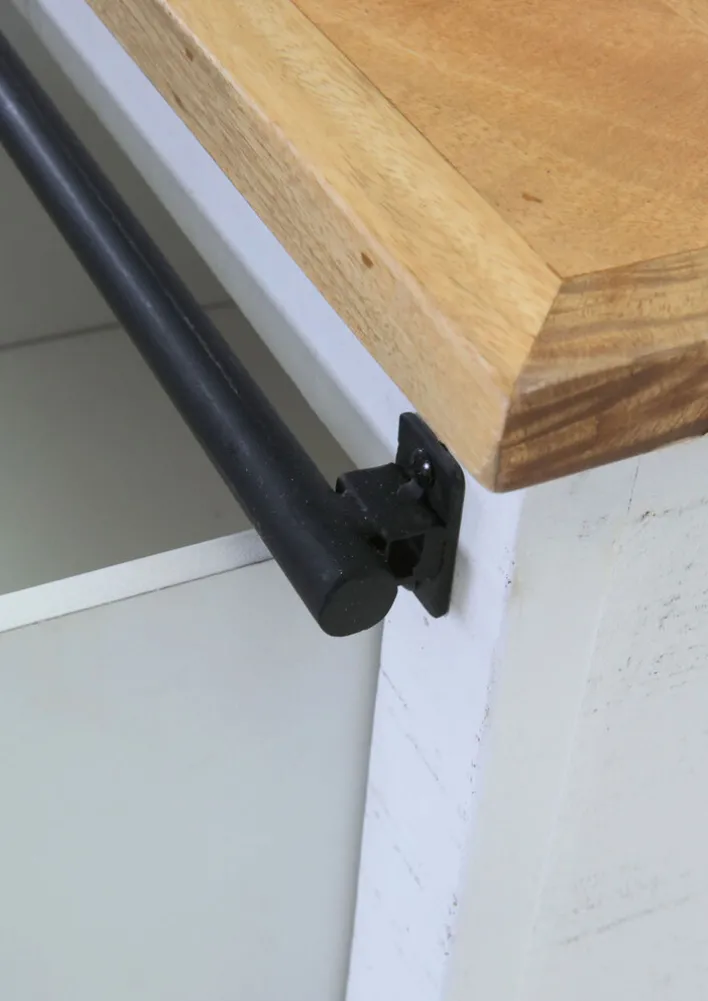 Farbe: BraunWeißSchwarzFarbton: Rahmen: Mango massiv sägerau, weiß lackiert/Tischplatte, Schiebetüren & Schubladenfront: Mango massiv natur, gebeizt und lackiert; Metallaplikationen: schwarz lackiert/Inneneinteilung, Seitenpaneele und Rückwand: MDF, weiß lackiertHauptfarbe: Braun